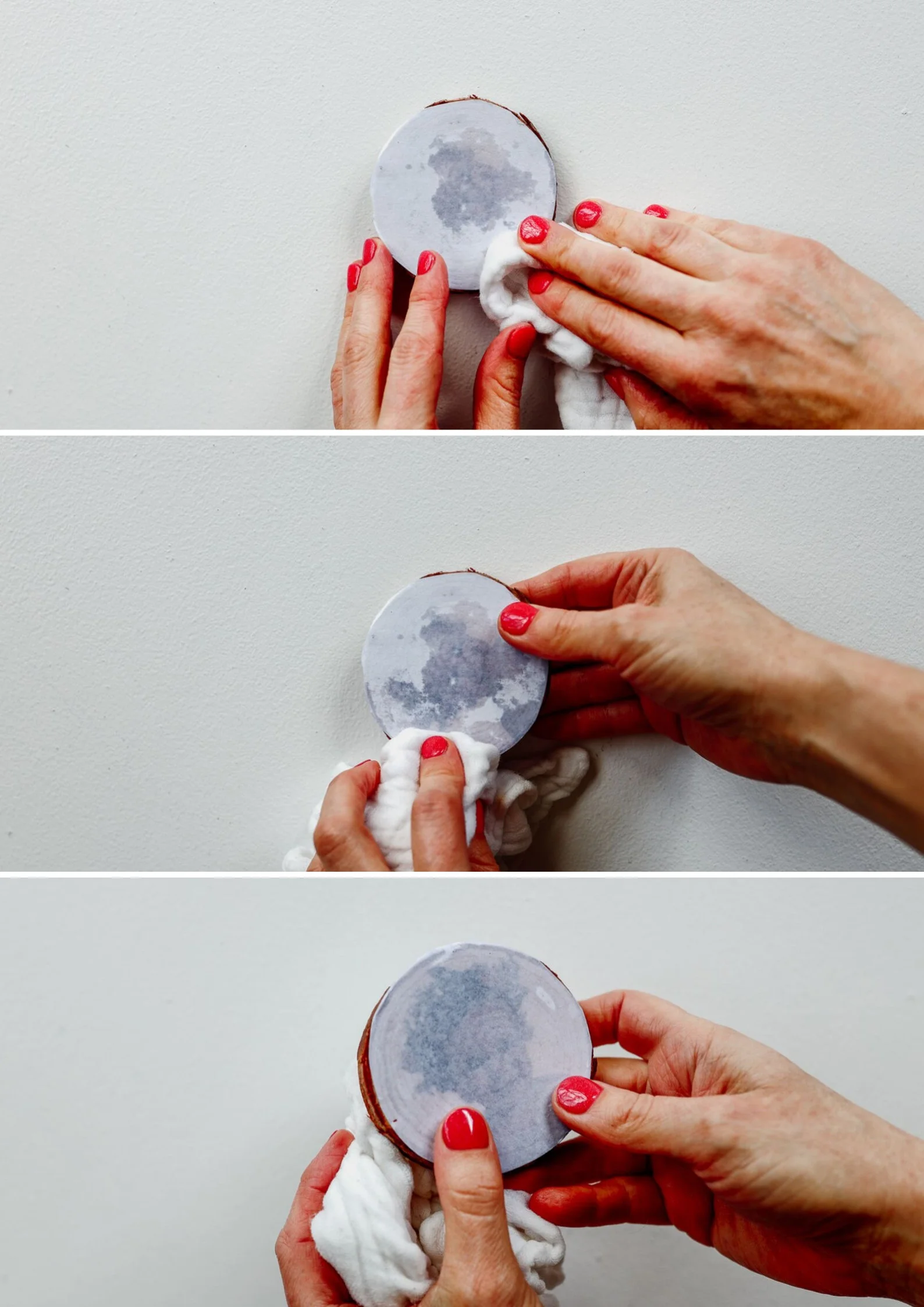 Grab your textile and bowl of water, and dab the wet fabric on the image, and so that the paper gets quite saturated. Yous don't want to totally dunk the wooden round in the water, but y'all'll need it to exist pretty soaked.