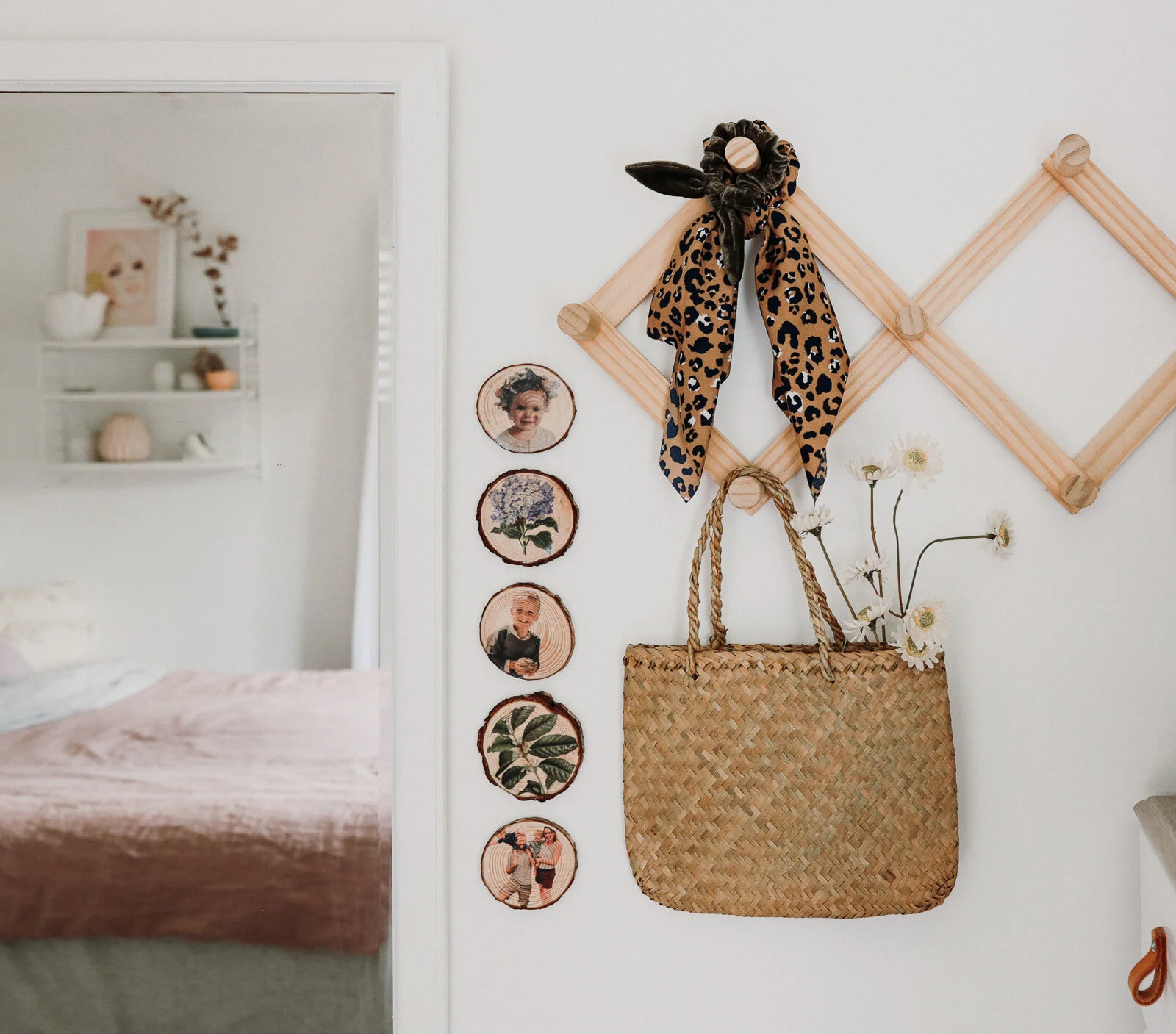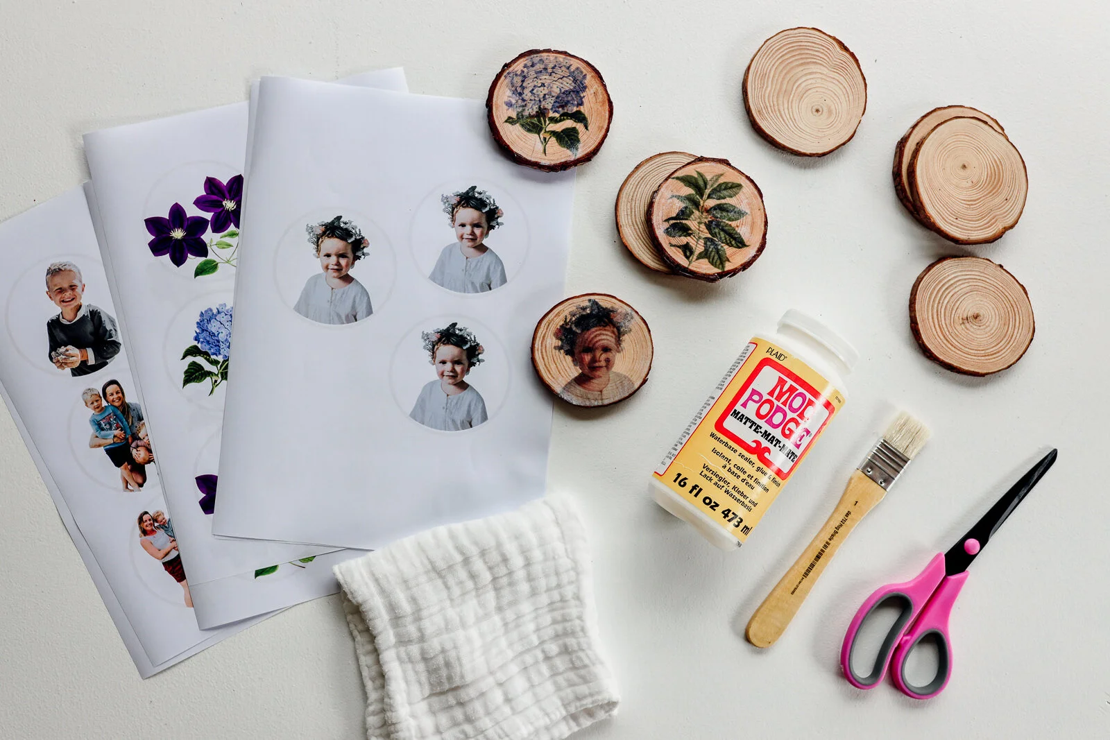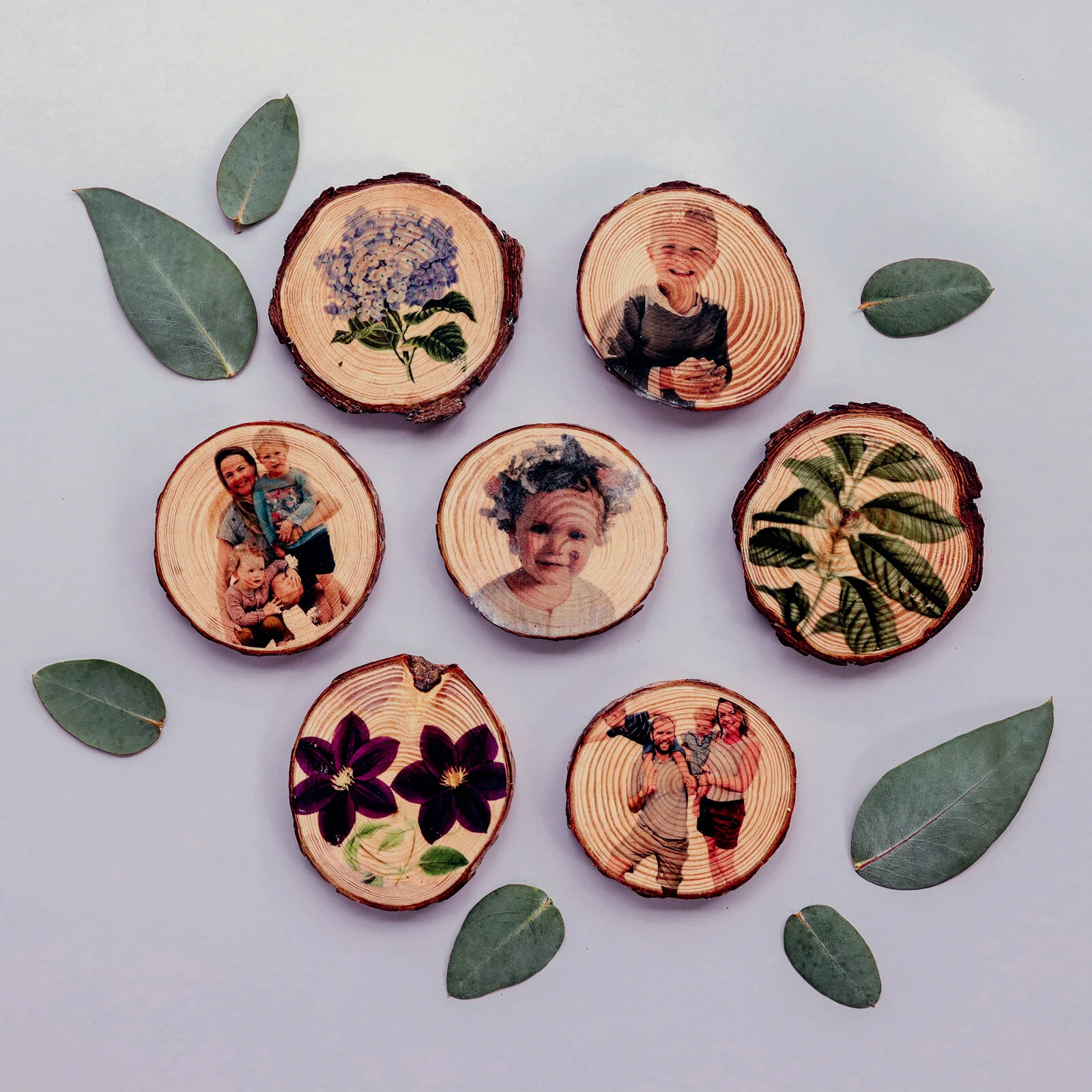 Make sure yous size the photos so that they will print out and fit onto the wooden rounds. I actually used Canva to create a page of circular images, just you could just print and trace suitably sized circles over the tiptop of each image, then cut them out.